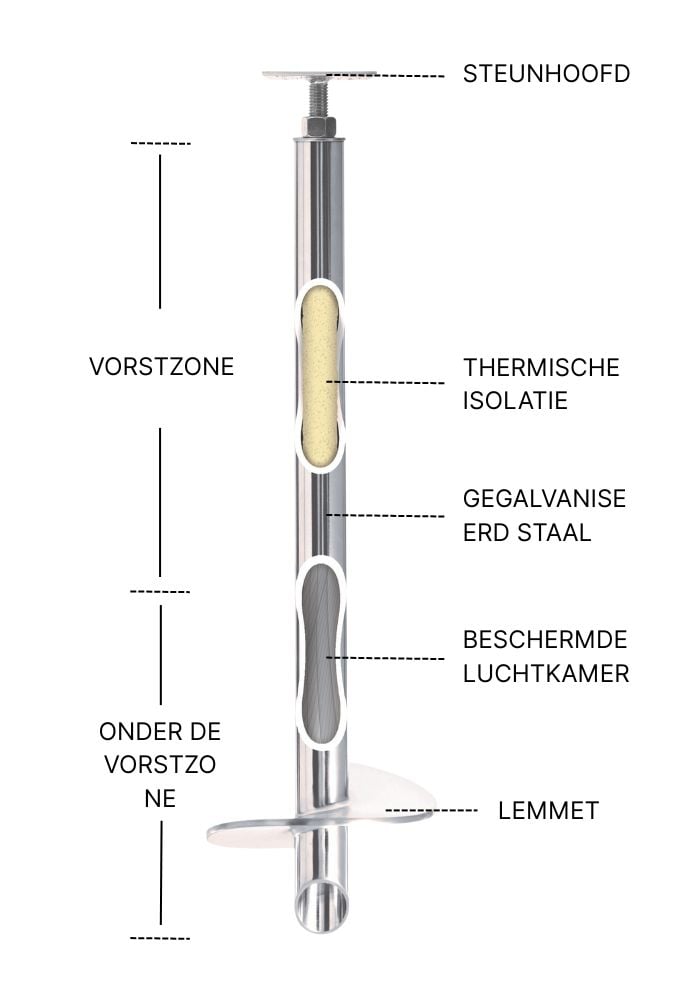 Thermal Piles gebruiken een isolatiesysteem dat een beschermingszone vormt en voorkomt dat water, koude lucht, vorst of ijs zich aan de basis van de paal ophopen.